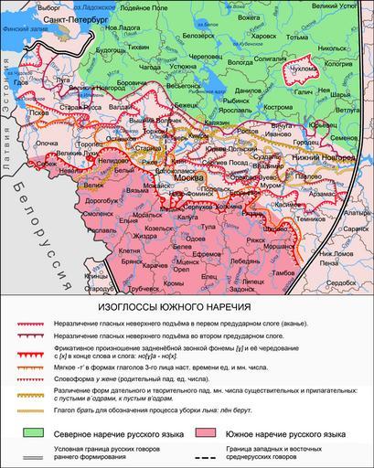 | Keywords: Изоглоссы-южного-наречия.png ru Ка та изоглосс южного на ечия на те ито ии с едне усских гово ов а основе данных Заха ова К Ф О лова В Г Диалектное членение усского языка аука 1970 2-е изд Едито иал УРСС 2004 http //www gramota ru/book/village/dialects html Язык усской де евни own Trevbus 2010-08-13 Dialect areas of the Russian language |