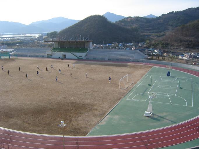 Keywords: PNU Miryang athletic.jpg Soccer game being played on the athletic field at the Miryang campus of Pusan National University Taken by User Visviva 2006-12-18 own assumed Visviva Miryang campus of Pusan National University