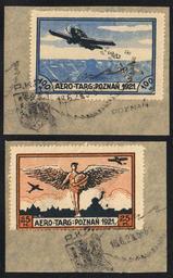| Keywords: Poland 1921 TABROMIK.jpg Aero-Targ Company in agreement with the Polish Ministry of Post Telegraph Aero-Targ stamps had to be bought for airmail in addition to the normal express postage rate payable by usage of regular Polish stamps The stamps were designed by Wilhelm Rudy initials W R on the stamps and crudely lithographed The stamps were perforated 11 25 but are also known imperforated The 25mk value shows Icarus against Poznan and the 100mk shows a Junkers F-13 plane dropping mail over Poznan Attached to each stamp was an advertising label inscribed T A B R O M I K for vodka factory TAdeusz BROnislaw MIKołajczyk The first flights from Poznan to Gdansk and to Warsaw were on 29 May 1921 The first return flight from Warsaw to Poznan was on 31 May 1921 There were daily return flights until 16 June 1921 A special winged postmark was used from May 29 thru 16 June 1921 at the Poznan Fair Flights Postmarks with dates after 16 June 1921 are fake Forged cancel 18 6 1921 Scan of original Aero-Targ Company PD-old Counterfeit stamps of Poland Philatelic fakes and forgeries Junkers F 13 Blue stamps Orange stamps Economy of Gniezno History of Poznań |