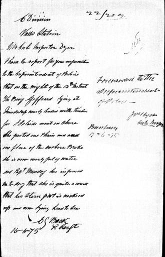 Keywords: Police report of the shipwreck of 'Geffrard'.png en Police report of the Geffrard sinking on 1875-06-13 WA State Records Office ACC 129 File 22-209 1875-06-17 Busselton Police Station 1875 Sub-Inspector Dyer thumb left A lower-resolution JPG version because the PNG version doens't render at some sizes PD-old Uploaded with UploadWizard Geffrard ship 1853 |