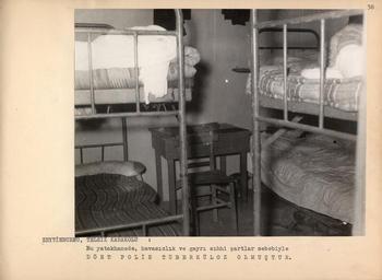 Keywords: salt araştırma saltaraştırma salt research saltresearch salt online saltonline karakol binaları karakolbinaları i̇stanbul karakol binaları istanbulkarakolbinaları eski karakol binaları eskikarakolbinaları karakol zeytinburnu emniyet amirliği zeytinburnuemniyetamirliği karakol yatakhanesi karakolyatakhanesi emniyet müdürlüğü araştırma bürosu emniyetmüdürlüğüaraştırmabürosu police stations policestations istanbul police stations istanbulpolicestations old police stations oldpolicestations i̇stanbul istanbul 1962 zeytinburnu telsiz karakolu zeytinburnutelsizkarakolu photo border monochrome “Karakol binalarının köhneliği ve gayrı sıhhi durumunu gösterir birkaç misal: 1. Fatih Emniyet Amirliği, Karagümrük Merkezi, Kızıltoprak Merkezi binalarının maili inhidam olmaları ve bu durumları ile tehlike arz etmeleri sebebiyle mezkur merkezlerin amirleri, personellerini bu binaların yatakhanelerinde yatmaya icbar edememekte ve mes’uliyetten çekinmekteydiler. 2. Zeytinburnu Emniyet Amirliğine bağlı telsiz karakolu yatakhanesinde havasızlık sebebiyle hiçbir memur yatamamaktadır. Telsiz karakolunda daha evvelce vazife gören ve karakolda yatan memurlardan dört tanesi tüberküloz olmuştur. 3. Mevcut 53 ahşap karakolun damları kış aylarında akmaktadır ve bu karakollar normal bir şekilde ısıtılamadığı için personelleri devamlı olarak hastalıktan kurtulamamaktadır.” Kaynak: “İstanbul ve Polisi”, T.C. İstanbul Vilayeti Emniyet Müdürlüğü Araştırma Bürosu, 1962 SALT Araştırma, Fotoğraf Arşivi SALT Research, Photography Archive “Karakol binalarının köhneliği ve gayrı sıhhi durumunu gösterir birkaç misal: 1. Fatih Emniyet Amirliği, Karagümrük Merkezi, Kızıltoprak Merkezi binalarının maili inhidam olmaları ve bu durumları ile tehlike arz etmeleri sebebiyle mezkur merkezlerin amirleri, personellerini bu binaların yatakhanelerinde yatmaya icbar edememekte ve mes’uliyetten çekinmekteydiler. 2. Zeytinburnu Emniyet Amirliğine bağlı telsiz karakolu yatakhanesinde havasızlık sebebiyle hiçbir memur yatamamaktadır. Telsiz karakolunda daha evvelce vazife gören ve karakolda yatan memurlardan dört tanesi tüberküloz olmuştur. 3. Mevcut 53 ahşap karakolun damları kış aylarında akmaktadır ve bu karakollar normal bir şekilde ısıtılamadığı için personelleri devamlı olarak hastalıktan kurtulamamaktadır.” Kaynak: “İstanbul ve Polisi”, T.C. İstanbul Vilayeti Emniyet Müdürlüğü Araştırma Bürosu, 1962 SALT Araştırma, Fotoğraf Arşivi SALT Research, Photography Archive |