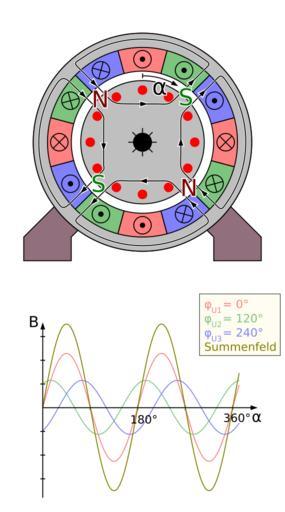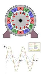 | Keywords: Polpaar zahl 2 2.svg de 4-polige Asynchronmaschine mit drei Strängen und darunter ein Diagramm das die Feldstärke im Luftspalt zwischen Rotor und Stator zeigt als Summe und zerlegt in die einzelnen Anteile der Stränge in dem Moment bei der die rot gezeichnete Phase im Maximum steht Durch spezielle Wickeltechnik hat die Feldstärke einen sinusförmigen Verlauf <br/> siehe de Polpaarzahl Own Biezl File Polpaar_zahl_2 svg Inkscape SVG electric motors | ||||