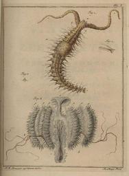 Keywords: Polydora ciliata and Callianira hexagona.jpg De zee-duizendbeen Nereis met hoornswijze voelers Scolopendra marina tentaculis cornu-formibus later herkend door van Benthem Jutting 1970 als de franjeworm of slikkokerworm Polydora ciliata 3 - 4 De zeshoekige beroƫ opblazer Inflator later herkend door van Benthem Jutting 1970 als een ribkwalletje Callianira hexagona en Polydora ciliata and Callianira hexagona http //www marinespecies org/aphia php p image pic 15919 P M Brasser in Slabber M 1778 Public domain confirmed by e-mail with web host PD-old-100 Polydora ciliata Callianira hexagona