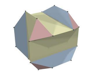 | Keywords: Polyhedron with no vertex visible from center.png  This simple non-convex polyhedron is constructed so that none of its 24 vertices marked with black balls can be seen from a region around its center This counterexample shows that placing observers at each vertex is not a solution to the 3-dimensional generalization of the art gallery problem The blue faces are also not visible from the center Self-made using POV-Ray 3 6 for Windows 2007-11-06 Ilmari Karonen File // File 3d-art-gallery pov // Vers 3 6 // Desc A simple polyhedron with none of the vertices visible from the center // Date 2007-11-06 // Auth Ilmari Karonen // parameters controlling the width and depth of hidden gaps declare a 1 - 1/3 ; declare b 1 + 2/3 ; if b < 1/a warning B too small for a vertices will be visible from center end // textures for various surfaces declare T1 texture pigment color rgb<1 0 0 8 0 8> finish ambient 0 3 diffuse 0 7 declare T2 texture pigment color rgb<1 0 1 0 0 8> finish ambient 0 3 diffuse 0 7 declare T3 texture pigment color rgb<0 8 0 9 1 0> //pigment color rgb 0 transmit 1 finish ambient 0 3 diffuse 0 7 declare T4 texture pigment color rgb<0 8 0 8 0 8> finish diffuse 0 3 specular 1 0 // the polyhedron itself mesh // corner triangles triangle < 1 a b> < a b 1> < b 1 a> texture T1 triangle < 1 a -b> < a b -1> < b 1 -a> texture T1 triangle < 1 -a b> < a -b 1> < b -1 a> texture T1 triangle < 1 -a -b> < a -b -1> < b -1 -a> texture T1 triangle <-1 a b> <-a b 1> <-b 1 a> texture T1 triangle <-1 a -b> <-a b -1> <-b 1 -a> texture T1 triangle <-1 -a b> <-a -b 1> <-b -1 a> texture T1 triangle <-1 -a -b> <-a -b -1> <-b -1 -a> texture T1 // visible sides triangle < 1 a b> < 1 -a b> < 1 a -b> texture T2 triangle < 1 -a -b> < 1 -a b> < 1 a -b> texture T2 triangle <-1 a b> <-1 -a b> <-1 a -b> texture T2 triangle <-1 -a -b> <-1 -a b> <-1 a -b> texture T2 triangle < a b 1> <-a b 1> < a -b 1> texture T2 triangle <-a -b 1> <-a b 1> < a -b 1> texture T2 triangle < a b -1> <-a b -1> < a -b -1> texture T2 triangle <-a -b -1> <-a b -1> < a -b -1> texture T2 triangle < b 1 a> < b 1 -a> <-b 1 a> texture T2 triangle <-b 1 -a> < b 1 -a> <-b 1 a> texture T2 triangle < b -1 a> < b -1 -a> <-b -1 a> texture T2 triangle <-b -1 -a> < b -1 -a> <-b -1 a> texture T2 // hidden sides triangle < 1 a b> < b 1 a> < 1 a -b> texture T3 triangle < b 1 -a> < b 1 a> < 1 a -b> texture T3 triangle < 1 -a b> < b -1 a> < 1 -a -b> texture T3 triangle < b -1 -a> < b -1 a> < 1 -a -b> texture T3 triangle <-1 a b> <-b 1 a> <-1 a -b> texture T3 triangle <-b 1 -a> <-b 1 a> <-1 a -b> texture T3 triangle <-1 -a b> <-b -1 a> <-1 -a -b> texture T3 triangle <-b -1 -a> <-b -1 a> <-1 -a -b> texture T3 triangle < a b 1> < 1 a b> < a -b 1> texture T3 triangle < 1 -a b> < 1 a b> < a -b 1> texture T3 triangle <-a b 1> <-1 a b> <-a -b 1> texture T3 triangle <-1 -a b> <-1 a b> <-a -b 1> texture T3 triangle < a b -1> < 1 a -b> < a -b -1> texture T3 triangle < 1 -a -b> < 1 a -b> < a -b -1> texture T3 triangle <-a b -1> <-1 a -b> <-a -b -1> texture T3 triangle <-1 -a -b> <-1 a -b> <-a -b -1> texture T3 triangle < b 1 a> < a b 1> <-b 1 a> texture T3 triangle <-a b 1> < a b 1> <-b 1 a> texture T3 triangle < b 1 -a> < a b -1> <-b 1 -a> texture T3 triangle <-a b -1> < a b -1> <-b 1 -a> texture T3 triangle < b -1 a> < a -b 1> <-b -1 a> texture T3 triangle <-a -b 1> < a -b 1> <-b -1 a> texture T3 triangle < b -1 -a> < a -b -1> <-b -1 -a> texture T3 triangle <-a -b -1> < a -b -1> <-b -1 -a> texture T3 // mark vertices with black spheres sphere < 1 a b> 0 03 texture T4 sphere < a b 1> 0 03 texture T4 sphere < b 1 a> 0 03 texture T4 sphere < 1 a -b> 0 03 texture T4 sphere < a b -1> 0 03 texture T4 sphere < b 1 -a> 0 03 texture T4 sphere < 1 -a b> 0 03 texture T4 sphere < a -b 1> 0 03 texture T4 sphere < b -1 a> 0 03 texture T4 sphere < 1 -a -b> 0 03 texture T4 sphere < a -b -1> 0 03 texture T4 sphere < b -1 -a> 0 03 texture T4 sphere <-1 a b> 0 03 texture T4 sphere <-a b 1> 0 03 texture T4 sphere <-b 1 a> 0 03 texture T4 sphere <-1 a -b> 0 03 texture T4 sphere <-a b -1> 0 03 texture T4 sphere <-b 1 -a> 0 03 texture T4 sphere <-1 -a b> 0 03 texture T4 sphere <-a -b 1> 0 03 texture T4 sphere <-b -1 a> 0 03 texture T4 sphere <-1 -a -b> 0 03 texture T4 sphere <-a -b -1> 0 03 texture T4 sphere <-b -1 -a> 0 03 texture T4 sky_sphere pigment color rgb 1 // outside lights light_source <50 80 0> color rgb 0 2 area_light 5 x 5 y 9 9 adaptive 0 jitter circular orient parallel point_at <0 0 0> rotate 15 y light_source <50 -10 0> color rgb 0 1 area_light 5 x 5 y 9 9 adaptive 0 jitter circular orient parallel point_at <0 0 0> rotate 45 y light_source <50 20 0> color rgb 0 3 area_light 5 x 5 y 9 9 adaptive 1 jitter circular orient parallel point_at <0 0 0> rotate 75 y light_source <50 80 0> color rgb 0 2 area_light 5 x 5 y 9 9 adaptive 0 jitter circular orient parallel point_at <0 0 0> rotate 135 y light_source <50 -10 0> color rgb 0 1 area_light 5 x 5 y 9 9 adaptive 0 jitter circular orient parallel point_at <0 0 0> rotate 165 y light_source <50 20 0> color rgb 0 3 area_light 5 x 5 y 9 9 adaptive 1 jitter circular orient parallel point_at <0 0 0> rotate 195 y light_source <50 80 0> color rgb 0 2 area_light 5 x 5 y 9 9 adaptive 0 jitter circular orient parallel point_at <0 0 0> rotate 255 y light_source <50 -10 0> color rgb 0 1 area_light 5 x 5 y 9 9 adaptive 0 jitter circular orient parallel point_at <0 0 0> rotate 285 y light_source <50 20 0> color rgb 0 3 area_light 5 x 5 y 9 9 adaptive 1 jitter circular orient parallel point_at <0 0 0> rotate 315 y // inside lights light_source <0 0 0> color rgb 0 5 area_light 0 6 x 0 6 z 9 9 adaptive 1 jitter circular orient light_source <0 0 0> color rgb 0 5 area_light 0 4 x 0 4 z 9 9 adaptive 1 jitter circular orient // cameras camera location <8 0 5 0 -5 0> angle 30 look_at <0 0 0 0 0 0> right x image_width/image_height // outside //camera panoramic location <0 0 0> look_at <1 0 1> angle 180 // inside 180 degree panorama //camera locatio
