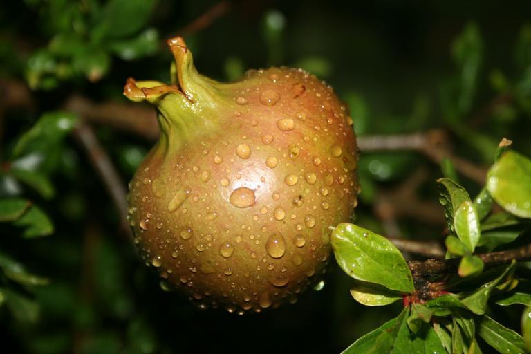 Keywords: pomegranate fruits plants ripening dew droplets water wet rainy outdoors gardens gardening foods edible raw sweet delicious healthy nutritious bright green leafy branches stems leaves