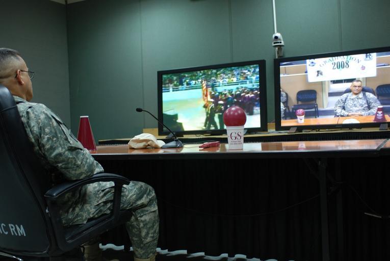Keywords: Pomp, circumstance around division DVIDS93402.jpg en Sgt Maj Fernando Garcia who resides in Killeen Texas and serves as the senior non-commissioned officer of logistics for Multi-National Division “ Baghdad and the 4th Infantry Division patiently waits to see his son Leonardo Garcia cross the stage during his graduation from Killeen High School The Garcia family was able to come together for this special event which took place during the early morning of June 9 in Iraq and the evening of June 8 in Texas through the use of video teleconference technology in the film room at the MND-B headquarters building and the Killeen Expo Center in Killeen Texas Garcia's eldest son was also able to view the event using a live internet feed from the Officer Basic Course in Fort Benning Georgia U S Army photo/Pfc Samantha Schutz 2008-06-09 https //www dvidshub net/image/93402 93402 2008-06-09 11 31 BAGHDAD IQ PD-USGov Fort Benning Images from DoD uploaded by Fæ |