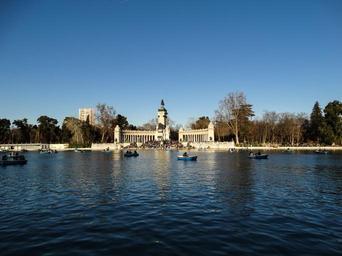 Keywords: pond duck nature landscape sky palace reflection lake madrid autumn water boats