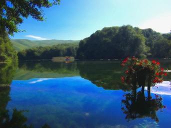 Keywords: pond lake water forest trees summer woods boat people reflections blue nature outside beautiful