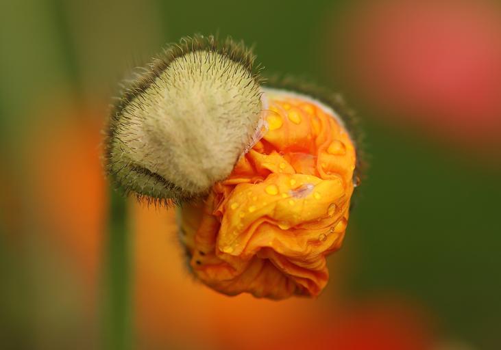 Keywords: poppy flower blossom poppy bud folded mohngewaechs macro nature flowers bright bursting hairy poppy bud color flora plant close salmon orange green