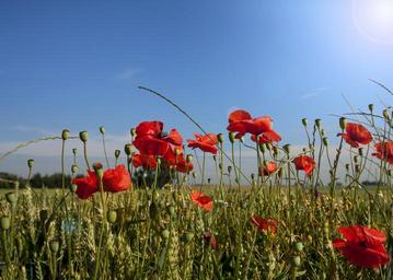Keywords: poppy landscape spring papaver klatschmohn red meadow field poppies red poppy nature field of poppies flowers mohngewaechs poppy flower pointed flower summer sea of flowers blue summer meadow early summer bud green sunshine close
