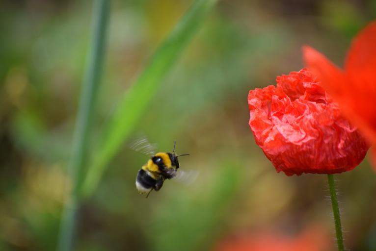 Keywords: poppy spring bee red nature flower insect pollination bloom flight