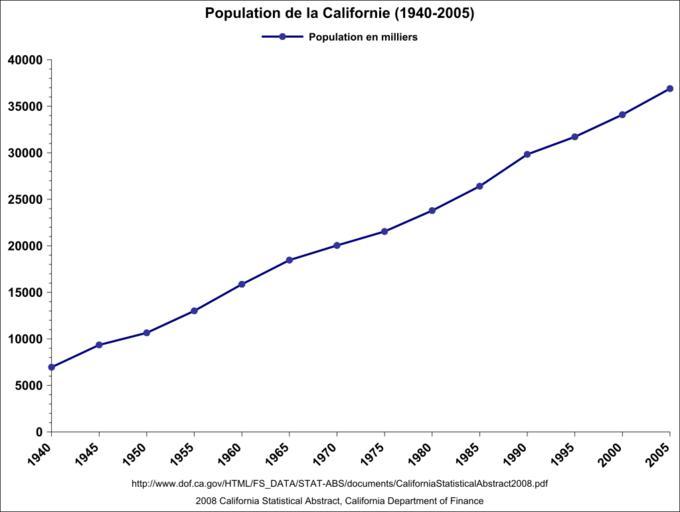 Keywords: Population Californie (1940-2005).svg fr Evolution de la population en Californie entre 1940 et 2005 Source url http //www dof ca gov/HTML/FS_DATA/STAT-ABS/documents/CaliforniaStatisticalAbstract2008 pdf 2008 California Statistical Abstract Own Urban 2009-05-01 File California Population 1940-2005 svg Demographics of California |