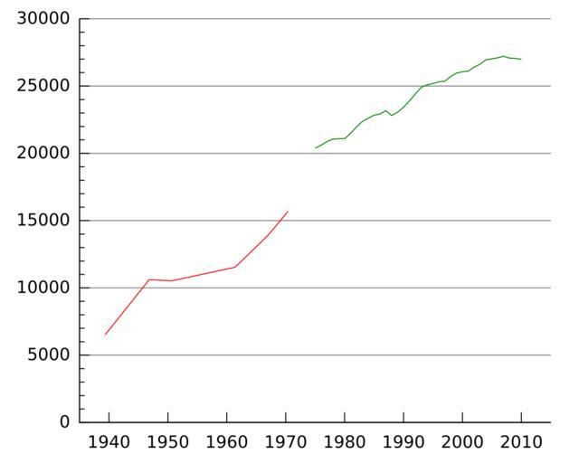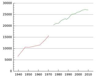 Keywords: Population Overath 1939-2010.svg de Bevölkerung von Overath Rot Alte Gemeindegrenzen bis 1975 Grün Neue Grenzen ab 1975 en Population of Overath Germany Red Old community boundaries until 1975 Green New boundaries from 1975 Own Dapete 2012-08-30 older version with fewer data points 1939-2007 Based on data from http //www overath de/Einwohnerstatistik aspx Created with gnuplot using the following commands <pre> set terminal svg enhanced fname DejaVu Sans fsize 14 set output 'Population Overath svg' set xdata time set timefmt x Y- m- d set format x Y set xrange 1935 2015 noreverse nowriteback set xtics 1940 1950 1960 1970 1980 1990 2000 2010 nomirror set yrange 0 noreverse nowriteback set ytics 5000 nomirror set mytics 5 set grid ytics set border 3 plot 'bev dat' using 1 2 title with lines 'bev dat' using 1 3 title with lines quit </pre> Contents of bev dat <pre> 1939-05-07 6511 1946-10-29 10620 1950-09-13 10534 1961-06-06 11544 1967-01-01 13914 1970-05-26 15694 1974-12-31 20379 1975-12-31 20606 1976-12-31 20877 1977-12-31 21051 1978-12-31 21090 1979-12-31 21095 1980-12-31 21476 1981-12-31 21960 1982-12-31 22363 1983-12-31 22610 1984-12-31 22838 1985-12-31 22918 1986-12-31 23169 1987-12-31 22814 1988-12-31 23060 1989-12-31 23435 1990-12-31 23902 1991-12-31 24413 1992-12-31 24904 1993-12-31 25087 1994-12-31 25192 1995-12-31 25319 1996-12-31 25361 1997-12-31 25713 1998-12-31 25969 1999-12-31 26059 2000-12-31 26115 2001-12-31 26410 2002-12-31 26629 2003-12-31 26964 2004-12-31 27022 2005-12-31 27106 2006-12-31 27213 2007-12-31 27081 2008-12-31 27057 2009-12-31 26999 </pre> Temporal population graphs of North Rhine-Westphalia Overath Files by User Dapete Images with Gnuplot source code Cc-zero