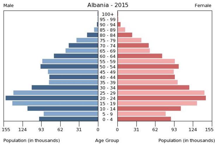 | Keywords: Population pyramid of Albania 2015.png en A population pyramid illustrates the age and sex structure of population and may provide insights about political and social stability as well as economic development The population is distributed along the horizontal axis with males shown on the left and females on the right The male and female populations are broken down into 5-year age groups represented as horizontal bars along the vertical axis with the youngest age groups at the bottom and the oldest at the top The shape of the population pyramid gradually evolves over time based on fertility mortality and international migration trends Віково-статева пі аміда населення Албанії за 2015 ік Вона дає наочне уявлення п о вікову і статеву ст укту а населення к аїни може слугувати дже елом інфо мації п о політичну і соціальну стабільність економічний озвиток Блакитними кольо ами ліво уч у вигляді го изонтальних смуг показані вікові г упи по 5 оків кожна чоловічої статі п аво уч ожевими жіночої аймолодші вікові г упи внизу найста іші вго і Фо ма пі аміди поступово еволюціонує з плином часу під впливом чинників на оджуваності сме тності і світової міг ації https //www cia gov/library/publications/the-world-factbook/ The World Factbook 2016-09-21 The Central Intelligence Agency Цент альне озвідувальне уп авління PD-USGov Population pyramids of Albania |