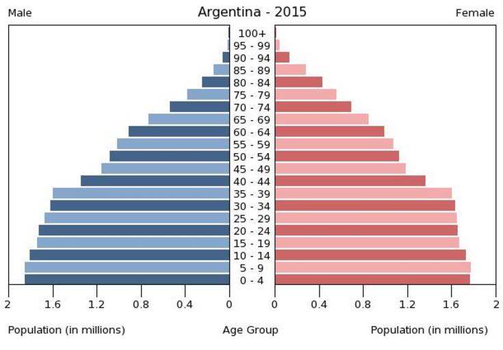 | Keywords: Population pyramid of Argentina 2015.png en A population pyramid illustrates the age and sex structure of population and may provide insights about political and social stability as well as economic development The population is distributed along the horizontal axis with males shown on the left and females on the right The male and female populations are broken down into 5-year age groups represented as horizontal bars along the vertical axis with the youngest age groups at the bottom and the oldest at the top The shape of the population pyramid gradually evolves over time based on fertility mortality and international migration trends Віково-статева пі аміда населення А гентини за 2015 ік Вона дає наочне уявлення п о вікову і статеву ст укту а населення к аїни може слугувати дже елом інфо мації п о політичну і соціальну стабільність економічний озвиток Блакитними кольо ами ліво уч у вигляді го изонтальних смуг показані вікові г упи по 5 оків кожна чоловічої статі п аво уч ожевими жіночої аймолодші вікові г упи внизу найста іші вго і Фо ма пі аміди поступово еволюціонує з плином часу під впливом чинників на оджуваності сме тності і світової міг ації https //www cia gov/library/publications/the-world-factbook/ The World Factbook 2016-09-21 The Central Intelligence Agency Цент альне озвідувальне уп авління PD-USGov Population pyramids of Argentina |