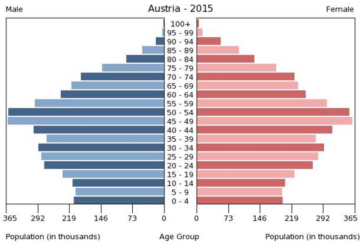 | Keywords: Population pyramid of Austria 2015.png en A population pyramid illustrates the age and sex structure of population and may provide insights about political and social stability as well as economic development The population is distributed along the horizontal axis with males shown on the left and females on the right The male and female populations are broken down into 5-year age groups represented as horizontal bars along the vertical axis with the youngest age groups at the bottom and the oldest at the top The shape of the population pyramid gradually evolves over time based on fertility mortality and international migration trends Віково-статева пі аміда населення Авст ії за 2015 ік Вона дає наочне уявлення п о вікову і статеву ст укту а населення к аїни може слугувати дже елом інфо мації п о політичну і соціальну стабільність економічний озвиток Блакитними кольо ами ліво уч у вигляді го изонтальних смуг показані вікові г упи по 5 оків кожна чоловічої статі п аво уч ожевими жіночої аймолодші вікові г упи внизу найста іші вго і Фо ма пі аміди поступово еволюціонує з плином часу під впливом чинників на оджуваності сме тності і світової міг ації https //www cia gov/library/publications/the-world-factbook/ The World Factbook 2016-09-21 The Central Intelligence Agency Цент альне озвідувальне уп авління PD-USGov Population pyramids of Austria |