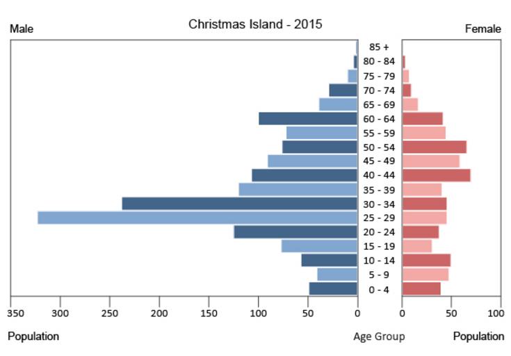 Keywords: Population pyramid of Christmas Island 2015.png en A population pyramid illustrates the age and sex structure of population and may provide insights about political and social stability as well as economic development The population is distributed along the horizontal axis with males shown on the left and females on the right The male and female populations are broken down into 5-year age groups represented as horizontal bars along the vertical axis with the youngest age groups at the bottom and the oldest at the top The shape of the population pyramid gradually evolves over time based on fertility mortality and international migration trends Віково-статева пі аміда населення Ост ова Різдва за 2015 ік Вона дає наочне уявлення п о вікову і статеву ст укту а населення к аїни може слугувати дже елом інфо мації п о політичну і соціальну стабільність економічний озвиток Блакитними кольо ами ліво уч у вигляді го изонтальних смуг показані вікові г упи по 5 оків кожна чоловічої статі п аво уч ожевими жіночої аймолодші вікові г упи внизу найста іші вго і Фо ма пі аміди поступово еволюціонує з плином часу під впливом чинників на оджуваності сме тності і світової міг ації https //www cia gov/library/publications/the-world-factbook/ The World Factbook 2016-09-21 The Central Intelligence Agency Цент альне озвідувальне уп авління PD-USGov Population pyramids of Australia |