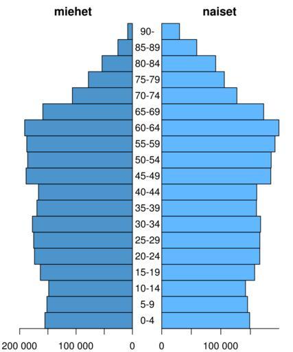 | Keywords: Population pyramid of Finland 2012.svg en Finnish population by age and gender end of 2012 Men left dark blue / Women right light blue fi Suomen väestö iän ja sukupuolen mukaan vuoden 2012 lopussa Miehet vasen tumman sininen / Naiset oikea vaalean sininen 2013-04-29 20 26 24 Data from http //www tilastokeskus fi/tup/suoluk/suoluk_vaesto_en html Statistics Finland Population by age group end of 2012 graph generated by R Qtea R source Modified from File Fin population by age 2005 png by User Jkv <pre> m <- c 155281 151706 148569 163421 173775 175226 177454 169502 166649 188707 185863 187478 191222 158967 106568 78139 53901 25782 8412 w <- c 148802 145274 141760 157292 165983 166069 167305 160340 160821 184591 185308 191717 198366 172561 127231 105940 91302 59277 30113 a <- c 0-4 5-9 10-14 15-19 20-24 25-29 30-34 35-39 40-44 45-49 50-54 55-59 60-64 65-69 70-74 75-79 80-84 85-89 90- svg fin_population_by_age svg width 5 height 5 1 2 par mfcol c 1 2 mar c 2 1 2 2 1 2 y <- barplot -m space 0 horiz T xlim c -210000 0 axes F yaxs i col steelblue3 title main miehet cex 8 axis 1 at -4 0 50000 labels c 200 000 100 000 0 barplot w space 0 horiz T axes F yaxs i col steelblue1 axis 1 at 0 4 50000 labels c 0 100 000 200 000 title main naiset cex 8 axis 2 at y labels a tick F las 1 line 1 hadj 5 dev off </pre> cc-zero Uploaded with UploadWizard Population pyramids of Finland |