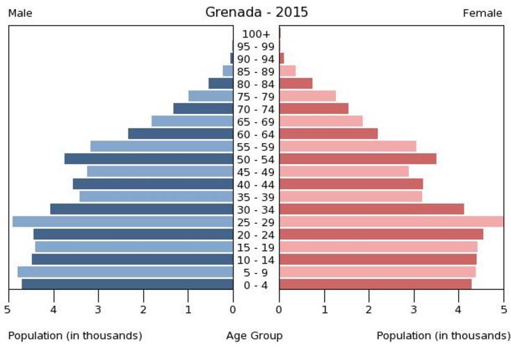 | Keywords: Population pyramid of Grenada 2015.png en A population pyramid illustrates the age and sex structure of population and may provide insights about political and social stability as well as economic development The population is distributed along the horizontal axis with males shown on the left and females on the right The male and female populations are broken down into 5-year age groups represented as horizontal bars along the vertical axis with the youngest age groups at the bottom and the oldest at the top The shape of the population pyramid gradually evolves over time based on fertility mortality and international migration trends Віково-статева пі аміда населення Г енади за 2015 ік Вона дає наочне уявлення п о вікову і статеву ст укту а населення к аїни може слугувати дже елом інфо мації п о політичну і соціальну стабільність економічний озвиток Блакитними кольо ами ліво уч у вигляді го изонтальних смуг показані вікові г упи по 5 оків кожна чоловічої статі п аво уч ожевими жіночої аймолодші вікові г упи внизу найста іші вго і Фо ма пі аміди поступово еволюціонує з плином часу під впливом чинників на оджуваності сме тності і світової міг ації https //www cia gov/library/publications/the-world-factbook/ The World Factbook 2016-09-21 The Central Intelligence Agency Цент альне озвідувальне уп авління PD-USGov Population pyramids of Grenada |