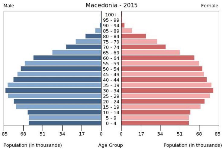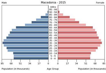 Keywords: Population pyramid of Macedonia 2015.png en A population pyramid illustrates the age and sex structure of population and may provide insights about political and social stability as well as economic development The population is distributed along the horizontal axis with males shown on the left and females on the right The male and female populations are broken down into 5-year age groups represented as horizontal bars along the vertical axis with the youngest age groups at the bottom and the oldest at the top The shape of the population pyramid gradually evolves over time based on fertility mortality and international migration trends Віково-статева пі аміда населення Республіки акедонія за 2015 ік Вона дає наочне уявлення п о вікову і статеву ст укту а населення к аїни може слугувати дже елом інфо мації п о політичну і соціальну стабільність економічний озвиток Блакитними кольо ами ліво уч у вигляді го изонтальних смуг показані вікові г упи по 5 оків кожна чоловічої статі п аво уч ожевими жіночої аймолодші вікові г упи внизу найста іші вго і Фо ма пі аміди поступово еволюціонує з плином часу під впливом чинників на оджуваності сме тності і світової міг ації https //www cia gov/library/publications/the-world-factbook/ The World Factbook 2016-09-21 The Central Intelligence Agency Цент альне озвідувальне уп авління PD-USGov Population pyramids of Macedonia |