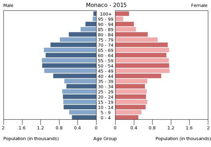 | Keywords: Population pyramid of Monaco 2015.png en A population pyramid illustrates the age and sex structure of population and may provide insights about political and social stability as well as economic development The population is distributed along the horizontal axis with males shown on the left and females on the right The male and female populations are broken down into 5-year age groups represented as horizontal bars along the vertical axis with the youngest age groups at the bottom and the oldest at the top The shape of the population pyramid gradually evolves over time based on fertility mortality and international migration trends Віково-статева пі аміда населення онако за 2015 ік Вона дає наочне уявлення п о вікову і статеву ст укту а населення к аїни може слугувати дже елом інфо мації п о політичну і соціальну стабільність економічний озвиток Блакитними кольо ами ліво уч у вигляді го изонтальних смуг показані вікові г упи по 5 оків кожна чоловічої статі п аво уч ожевими жіночої аймолодші вікові г упи внизу найста іші вго і Фо ма пі аміди поступово еволюціонує з плином часу під впливом чинників на оджуваності сме тності і світової міг ації https //www cia gov/library/publications/the-world-factbook/ The World Factbook 2016-09-21 The Central Intelligence Agency Цент альне озвідувальне уп авління PD-USGov Population pyramids of Monaco |