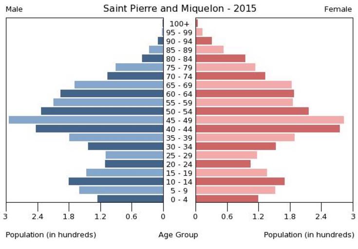 | Keywords: Population pyramid of Saint Pierre and Miquelon 2015.png en A population pyramid illustrates the age and sex structure of population and may provide insights about political and social stability as well as economic development The population is distributed along the horizontal axis with males shown on the left and females on the right The male and female populations are broken down into 5-year age groups represented as horizontal bars along the vertical axis with the youngest age groups at the bottom and the oldest at the top The shape of the population pyramid gradually evolves over time based on fertility mortality and international migration trends Віково-статева пі аміда населення Сен-П'є у і ікелону за 2015 ік Вона дає наочне уявлення п о вікову і статеву ст укту а населення к аїни може слугувати дже елом інфо мації п о політичну і соціальну стабільність економічний озвиток Блакитними кольо ами ліво уч у вигляді го изонтальних смуг показані вікові г упи по 5 оків кожна чоловічої статі п аво уч ожевими жіночої аймолодші вікові г упи внизу найста іші вго і Фо ма пі аміди поступово еволюціонує з плином часу під впливом чинників на оджуваності сме тності і світової міг ації https //www cia gov/library/publications/the-world-factbook/ The World Factbook 2016-09-21 The Central Intelligence Agency Цент альне озвідувальне уп авління PD-USGov Population pyramids of Saint Pierre and Miquelon |
