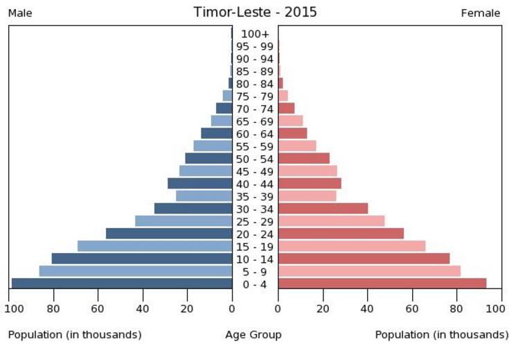 | Keywords: Population pyramid of Timor-Leste 2015.png en A population pyramid illustrates the age and sex structure of population and may provide insights about political and social stability as well as economic development The population is distributed along the horizontal axis with males shown on the left and females on the right The male and female populations are broken down into 5-year age groups represented as horizontal bars along the vertical axis with the youngest age groups at the bottom and the oldest at the top The shape of the population pyramid gradually evolves over time based on fertility mortality and international migration trends Віково-статева пі аміда населення Східного Тимо у за 2015 ік Вона дає наочне уявлення п о вікову і статеву ст укту а населення к аїни може слугувати дже елом інфо мації п о політичну і соціальну стабільність економічний озвиток Блакитними кольо ами ліво уч у вигляді го изонтальних смуг показані вікові г упи по 5 оків кожна чоловічої статі п аво уч ожевими жіночої аймолодші вікові г упи внизу найста іші вго і Фо ма пі аміди поступово еволюціонує з плином часу під впливом чинників на оджуваності сме тності і світової міг ації https //www cia gov/library/publications/the-world-factbook/ The World Factbook 2016-09-21 The Central Intelligence Agency Цент альне озвідувальне уп авління PD-USGov Population pyramids of Timor-Leste |