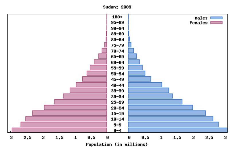 | Keywords: Population Pyramids for Sudan.png de Bevölkerungspyramide von Sudan 2009 en Population pyramid of Sudan 2009 own Demmo 2010-05-30 U S Census bureau International database http //www census gov/ipc/www/idb/country php Version 4 2 patchlevel 2 n POPULATION PYRAMID Script last modified 30-May-2010 scale 1000000 ADJUST AS NECESSARY The increment would better be automatic but set xtics doesn't allow to specify start only increment 0 5 ADJUST THIS AS NECESSARY gap_width 0 11 ADJUST THIS AS NECESSARY ADJUST TITLES AS NECESSARY set title Sudan 2009 set xlabel Population in millions Input file contains comma-separated values fields set datafile separator Plot to dummy device and retrieve the male/female population range set term unknown set autoscale xfix plot data csv using 4/scale 2 data csv using - 5/scale 2 range_male GPVAL_X_MAX > -GPVAL_X_MIN GPVAL_X_MAX -GPVAL_X_MIN range_female range_male central_gap range_male + range_female gap_width set term png transparent truecolor size 640 400 set term svg size 800 500 dynamic font sans-serif set style data boxxyerrorbars set style fill solid 0 5 border Y axis is invisible unset ytics set autoscale yfix X axis is labeled from zero onwards with the given increment set xrange -range_female-central_gap range_male set xtics nomirror 0 increment set x2range range_female -central_gap-range_male set x2tics axis 0 increment plot \ data csv using 0 2 0 4/scale 2 2+4 \ title Males linetype rgb 296dcc \ data csv using 0 2 0 5/scale 2 2+4 axes x2y1\ title Females linetype rgb aa3f74 \ data csv using -central_gap/2 2+1 8 2 title with labels CSV pyramid data file as retrieved from US Census Bureau International Database without modifications Data file data csv <pre> Midyear Population by Age and Sex for Sudan Year Age Both Sexes Population Male Population Female Population 2009 Total 41087825 20814202 20273623 2009 0-4 6047331 3093636 2953695 2009 5-9 5486782 2802202 2684580 2009 10-14 5175054 2639713 2535341 2009 15-19 4721582 2406264 2315318 2009 20-24 3952124 2007303 1944821 2009 25-29 3291862 1669376 1622486 2009 30-34 2722728 1372194 1350534 2009 35-39 2410179 1261329 1148850 2009 40-44 1989885 1038703 951182 2009 45-49 1453135 697716 755419 2009 50-54 1127232 514963 612269 2009 55-59 948853 435047 513806 2009 60-64 732009 342788 389221 2009 65-69 506722 255345 251377 2009 70-74 309703 163341 146362 2009 75-79 142581 76211 66370 2009 80-84 52876 28711 24165 2009 85-89 14410 7865 6545 2009 90-94 2527 1365 1162 2009 95-99 239 127 112 2009 100+ 11 3 8 </pre> Population pyramids Sudan Demographics of Sudan |