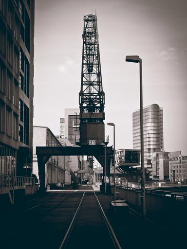Keywords: port crane industry harbour cranes harbour crane load crane inner harbour rhine silhouette düsseldorf atmosphere