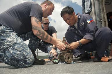 | Keywords: Port visit 120906-N-CB621-055.jpg en Gunner's Mate 1st Class Jason Moorehead assigned to the submarine tender USS Frank Cable AS 40 and Gunner's Mate 3rd Class Ramer Tuble assigned to the Republic of the Philippines navy frigate BRP Gregorio Del Pilar PF 15 disassemble a magazine sprinkler control valve Frank Cable Sailors are taking the opportunity to provide technical assistance and conduct training with the crew of Gregorio Del Pilar during a port visit Frank Cable conducts maintenance and support of submarine and surface vessels deployed in the U S 7th Fleet area of responsibility U S Navy photo by Mass Communication Specialist 1st Class Jason C Swink 2012-09-06 Petty Officer 1st Class Jason Swink https //www dvidshub net/image/660457 120906-N-CB621-055 2012-09-09 23 00 SUBIC BAY PH PD-USGov-Military-Navy USS Frank Cable AS-40 Images from DoD uploaded by Fæ |