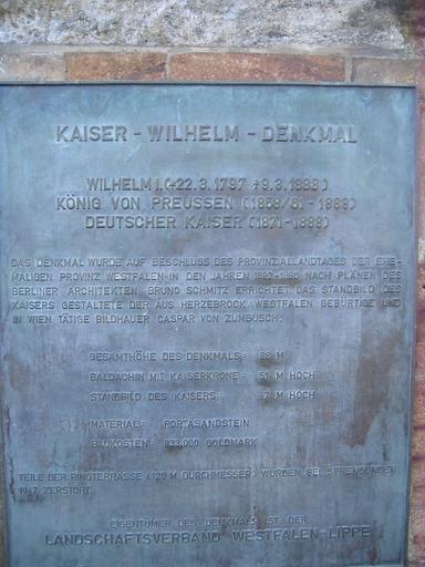 Keywords: Porta Westfalica, 2009-Nov 070.jpg Das Kaiser-Wilhelm-Denkmal an der Porta Westfalica auf dem Wittekindsberg und über dem Weserdurchbruch žPorta Westfalica bei der gleichnamigen Stadt Porta Westfalica Kreis Minden-Lübbecke Nordrhein-Westfalen Wilhelm I monument near Porta Westfalica District of Minden-Lübbecke North Rhine-Westphalia Germany Mémorial pour Guillaume Ier d'Allemagne près de Porta Westfalica arrondissement de Minden-Lübbecke Rhénanie-du-Nord-Westphalie Allemagne TUBS/Translation own IXUS 500 2009-11-20 TUBS 52 14 44 3 N 8 54 19 06 E region DE_heading S TUBS GFDL cc-by-3 0 2 5 2 0 1 0 cc-by-sa-3 0 2 5 2 0 1 0 TUBS/Credits Kaiser-Wilhelm-Denkmal an der Porta Westfalica Plaques in Kreis Minden-Lübbecke |