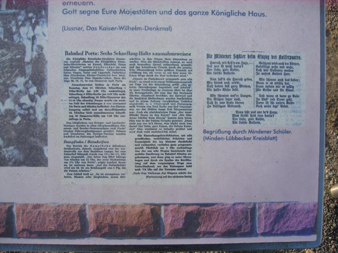 Keywords: Porta Westfalica, 2009-Nov 085.jpg Tafel am Kaiser-Wilhelm-Denkmal an der Porta Westfalica auf dem Wittekindsberg und über dem Weserdurchbruch žPorta Westfalica bei der gleichnamigen Stadt Porta Westfalica Kreis Minden-Lübbecke Nordrhein-Westfalen Sign at Wilhelm I monument near Porta Westfalica District of Minden-Lübbecke North Rhine-Westphalia Germany Information au mémorial pour Guillaume Ier d'Allemagne près de Porta Westfalica arrondissement de Minden-Lübbecke Rhénanie-du-Nord-Westphalie Allemagne TUBS/Translation own IXUS 500 2009-11-20 TUBS 52 14 42 88 N 8 54 22 13 E region DE_heading W TUBS GFDL cc-by-3 0 2 5 2 0 1 0 cc-by-sa-3 0 2 5 2 0 1 0 TUBS/Credits Kaiser-Wilhelm-Denkmal an der Porta Westfalica Signs in Porta Westfalica Train stations in Porta Westfalica Mindener Tageblatt |
