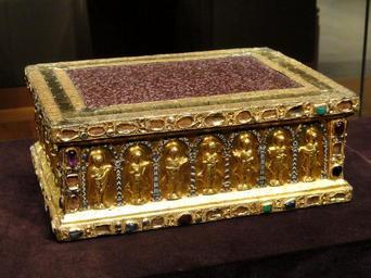 | Keywords: Portable Altar of Countess Gertrude, shortly after 1038, from the Guelph Treasure, German, Lower Saxony, gold, enamel, porphyry, gems, pearls, niello - Cleveland Museum of Art - DSC08528.JPG en Exhibit in the Cleveland Museum of Art Cleveland Ohio USA Photography was permitted in the museum without restriction This artwork is old enough so that it is in the public domain Daderot 2012-09-07 13 59 34 Daderot cc0 cc0 Guelph Treasure Cleveland Museum of Art Porphyry slabs | ||||