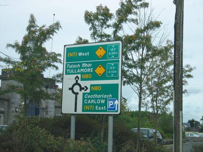 | Keywords: Portlaoise Abbeyleix Road Roadsign.JPG Typical Irish roadsign at roundabout junction in Portlaoise Explanation of symbols/colours The background of the sign in this case white Regional Road Rxxx /local road Lxxxx is based on the colour code for the road the sign/motorist is on The black-on-white diagram represents the roundabout ahead and the roads radiating from it The long black line indicates the direction of approach In this case the first exit from the roundabout is a local unsignposted road to the left the second exit is the N80 leading to Tullamore and access to the N7 west This area is patched green as the N80 and N7 are both National Routes the third exit is the N80 leading to Carlow and Access to the N7 east This area is also patched green as the N80 and N7 are both National Routes the gap in the roundabout symbol is to indicate that the next road is the one you are already on You could use the roundabout to do a U-turn provided you are not on a one-way street On the N80 heading for Tullamore and also on a section of the N7 heading west there there are low bridges This is highlighted by typical black-on-yellow diamonds and the heights in feet and in meters are given alongside the yellow warning diamonds At the bottom right is a sign for a car parking facility This picture has been taken in Portlaoise at the Abbeyleix Road south of the Abbeyleix Road Roundabout transferred from en-wp on 12 January 2007 Ž 2006-08-31 Sarah777 53 1 54 N 7 18 8 W en English wikipedia Sarah777 National secondary road signs Road signs in County Laois Roundabouts in County Laois Bilingual road signs in Ireland Roundabout signs Portlaoise Directional road signs in Ireland Limited height warning road signs in Ireland Pictures by Sarah777 August 2006 in Ireland 2006 in County Laois |