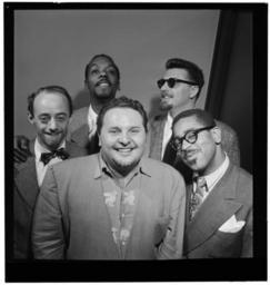 | Keywords: (Portrait of Dave Lambert, John Simmons, Chubby Jackson, George Handy, and Dizzy Gillespie, William P. Gottlieb's office, New York, N.Y., ca. July 1947) (LOC) (5354783200).jpg  Gottlieb William P 1917- photographer Portrait of Dave Lambert John Simmons Chubby Jackson George Handy and Dizzy Gillespie William P Gottlieb's office New York N Y ca July 1947 1 negative b w ; 2 1/4 x 2 1/4 in Caption from Down Beat For cover decoration this issue staff lensman Bill Gottlieb lined up five of the most familiar beards in the music world posed them simultaneously for a beard photo to end all beard photos--we hope Reading from left to right the gentry with the hirsute adornment are Dave Lambert John Simmons Chubby Jackson George Handy and Dizzy Gillespie You know of course that in the same order they are a singer two bass players an arranger and a trumpet man Notes Gottlieb Collection Assignment No 148 Purchase William P Gottlieb Forms part of William P Gottlieb Collection Library of Congress In Five beards on the cover Down Beat v 14 no 15 July 16 1947 Subjects Lambert Dave 1917- Simmons John 1918-1979 Jackson Chubby Handy George Gillespie Dizzy 1917- Jazz musicians--1940-1950 Format Portrait photographs--1940-1950 Group portraits--1940-1950 Film negatives--1940-1950 Rights Info Mr Gottlieb has dedicated these works to the public domain but rights of privacy and publicity may apply http //lcweb2 loc gov/diglib/ihas/html/gottlieb/gottlieb-copyright html lcweb2 loc gov/diglib/ihas/html/gottlieb/gottlieb-copyrig Repository negative Library of Congress Prints Photographs Division Washington D C 20540 USA http //hdl loc gov/loc pnp/pp print hdl loc gov/loc pnp/pp print Part Of William P Gottlieb Collection DLC 99-401005 General information about the Gottlieb Collection is available at http //lcweb2 loc gov/diglib/ihas/html/gottlieb/gottlieb-home html lcweb2 loc gov/diglib/ihas/html/gottlieb/gottlieb-home html Persistent URL http //hdl loc gov/loc music/gottlieb 12491 hdl loc gov/loc music/gottlieb 12491 Call Number LC-GLB23- 1249<br/> PD-Gottlieb https //www flickr com/photos/library_of_congress/5354783200/ Portrait of Dave Lambert John Simmons Chubby Jackson George Handy and Dizzy Gillespie William P Gottlieb's office New York N Y ca July 1947 LOC https //www flickr com/people/8623220 N02 The Library of Congress http //www loc gov/rr/print/195_copr html noknown The Library of Congress Flickr Commons Flickr-no known copyright restrictions The Library of Congress https //flickr com/photos/8623220 N02/5354783200 2015-09-01 22 51 20 pd Photographs by William P Gottlieb Dave Lambert John Simmons Dizzy Gillespie George Handy Chubby Jackson |