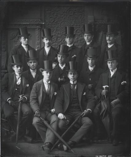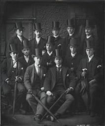 | Keywords: kalamazoo history public library photography portait group clothing formal hat michigan blackandwhite black and white Portrait of a group of young men, Kalamazoo, c.1885. Group of men in formal attire, including top hats. Front row - William Johnson, Wellington Hays. Center row - Lew Bleazby, Frank Bruen, William E. Kidder, Fred Wilson, Clyde Peck. Back row - George R. Hare, William Haynes, William Haskell, James T. Henderson, William Hanshue.  KPL catalogue number P-508 Portrait of a group of young men, Kalamazoo, c.1885. Group of men in formal attire, including top hats. Front row - William Johnson, Wellington Hays. Center row - Lew Bleazby, Frank Bruen, William E. Kidder, Fred Wilson, Clyde Peck. Back row - George R. Hare, William Haynes, William Haskell, James T. Henderson, William Hanshue.  KPL catalogue number P-508  |