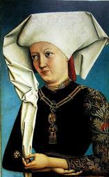 Keywords: Portrait of a Lady wearing the Order of the Swan.jpg Anonymous German Artist active at the Court of Ansbach This work in the Thyssen-Bornemisza Museum was attributed to various anonymous masters before Isolde Lübbeke associated it with an anonymous German painter of the Ansbach court active around 1490 The sitter stands out against a pale blue background Shown as richly dressed the artist particularly emphasises the striking brocade of her gown and the wimple that falls down over her shoulders in a slightly stiff manner Both her necklace and the carnation that she holds are significant elements given that the presence of the flower a pinkish-red pink and the wimple suggest that the panel may have had a pair In addition the gold chain with its two pendants one of the Virgin and Child and the other of a swan indicate that the sitter belonged to the Order of the Swan Founded in 1440 by Frederick II of Brandenburg this religious Order dedicated to the Virgin reached its peak of prestige and popularity in the late 15th century ca 1490 Oil on panel cm 44 7 28 2 Institution Museo Thyssen-Bornemisza accession number INV Nr 54 1935 2 object history ProvenanceEvent 1935 purchase Museo Thyssen-Bornemisza <br> Since at least the late 18th century http //www museothyssen org/en/thyssen/ficha_obra/812 Museo Thyssen-Bornemisza http //www museothyssen org/en/thyssen/ficha_obra/812 Museo Thyssen-Bornemisza other versions thumb left PD-old-100 DEFAULTSORT Anonymous 1490 circa; unknown woman 15th-century unidentified painters German paintings in the Thyssen-Bornemisza Museum Madrid 15th-century portrait paintings of unidentified women 1490s portrait paintings 15th-century oil on panel paintings 15th-century oil portraits of women at half length 15th-century portrait paintings in Spain Black clothing in art female Brocaded clothing in art Embroidered dresses in art Females with black dresses in art Females with livery collars in art White female headgear in portrait paintings Gold jewellery in art Portrait paintings of women of Germany Portrait paintings of females with flowers Portrait paintings with blue background Portraits holding carnation 1490s dresses Collar of the Order of the Swan in portraits |