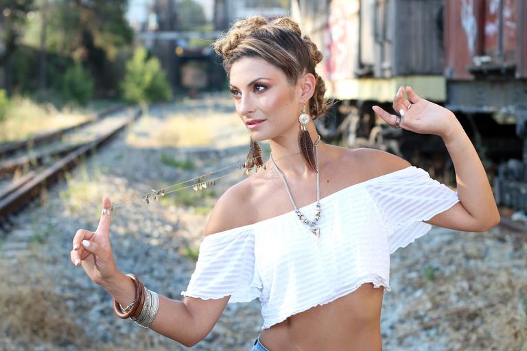 Keywords: portrait outdoors train happy woman female lifestyle fashion young summer girl adult