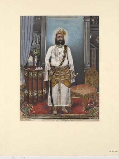 | Keywords: Portrait of Thakur Raja Bakhtawar Singh, standing in a European-style interior..jpg en 'Company paintings' were produced by Indian artists for Europeans living and working in the Indian subcontinent especially British employees of the East India Company They represent a fusion of traditional Indian artistic styles with conventions and technical features borrowed from western art Some Company paintings were specially commissioned while others were virtually mass-produced and could be purchased in bazaars This Company painting is a portrait of Thakur Raja Bakhtawar Singh made by Fateh Muhammad around 1880 in western Rajasthan probably Bikaner The Rajput princely states had strong artistic traditions of their own and their rulers were often generous patrons of painting Consequently Company painting never really developed in Rajasthan to the extent that it did in many other areas of India Occasionally however drawings were made in a semi-European style based on paintings from other parts of the country and towards the end of the 19th century rulers were depicted as here in a European manner strongly influenced by photography; but on the whole there is little Company painting from Rajasthan circa 1880 painted http //collections vam ac uk/item/O17904/painting-portrait-of-thakur-raja-bakhtawar/ Fateh Muhammad maker PD-Art Uploaded with UploadWizard Company style Art of India in the Victoria and Albert Museum Alwar State |