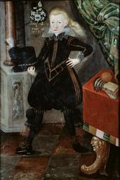 | Keywords: Porträtt. Carl Gustaf Wrangel som barn - Skoklosters slott - 39243.tif Carl Gustaf Wrangel plain text Helfigur fas långt hår guldstickad dräkt med i slitsar synligt grönt tyg spetskrage och manschetter knäbyxor stora knärosetter skor med skorosor vänster hand i midjan i höger hand svart hatt med juvelprydd kedja runt kullen svart fjäder och vit kvast Står i icke- perspektiviskt rum Till vänster röd kolonn på sockel Till höger bord med skulpterade förgyllda ben röd duk gul-vit-grön frans på duken ligger apelsin bok och handskar ovanför bordet grönt draperi med blommor <br/>Upptill Wrangelvapen samt text C G W ETATIS Suae 6 ANNo 1619 <br/>Klistrad direkt på prydnadsramen som är svartmålad med gulddekor på framsidan Ramlistens bredd 50 mm original caption Porträtt Carl Gustaf Wrangel som barn 1619 oil on canvas size mm 990 1450 SKO Carl Gustaf Wrangel Barn i ett gammalt slott - stormakt skatter spöken 1997 Skoklosters slott place of origin original filename sm_t08351_2148 23406 inventory number SKO 2148 39243 PD Samuel Uhrdin Samuel Uhrdin Portrait paintings Carl Gustaf Wrangel Media contributed by LSH 2013-10 |