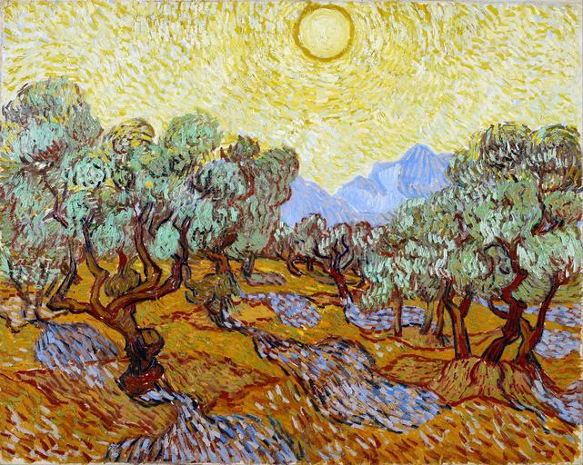Keywords: post impressionist post impressionism fine art blue dutch painter colorful iconic orchard nature natural plants garden sun green landscape gardening tree outdoor sunlight vincent van gogh painting