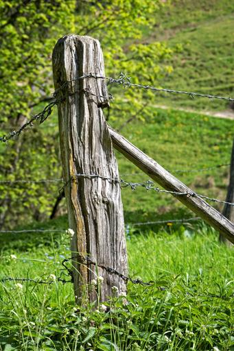 Keywords: post pasture fence fence demarcation old wire pile pasture cattle fence wooden posts wiring barrier security barbed wire fence barbed wire