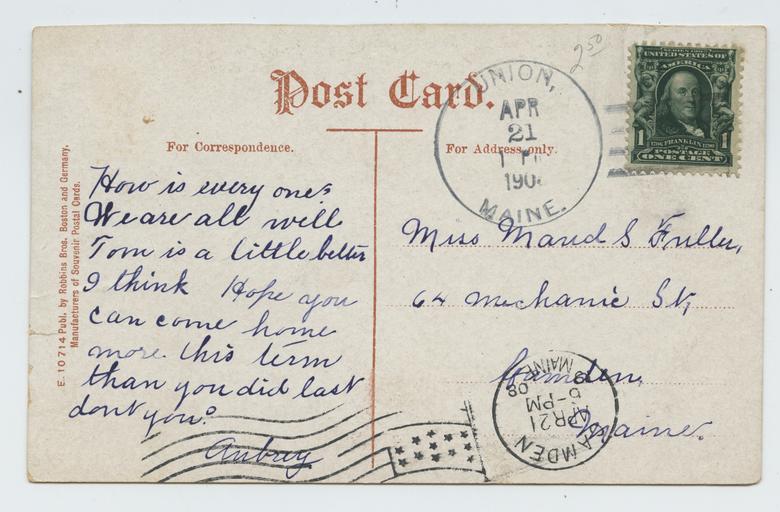 Keywords: postcards correspondence camden union aubrey audrey tom maud fuller maudfuller text writing document drawing sketch Postmark #1: Union, April 21, 1908, 1pm Postmark #2: Camden, April 21, 1908, 6pm How is every one? We are all well. Tom is a little better I think. Hope you can come home more this term than you did last don't you? Aubrey Addressed to: Miss Maud S. Fuller 64 Mechanic ST Camden, Maine Postmark #1: Union, April 21, 1908, 1pm Postmark #2: Camden, April 21, 1908, 6pm How is every one? We are all well. Tom is a little better I think. Hope you can come home more this term than you did last don't you? Aubrey Addressed to: Miss Maud S. Fuller 64 Mechanic ST Camden, Maine |