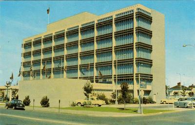 | Keywords: architecture building complex building outdoor "The B.C. Electric building in Victoria, B.C." Made in Canada by Grant-Mann Lithographers Ltd. "Color Card" Division, Vancouver, British Columbia.  The building is extant on the NE corner of Blanshard Street and Pandora Avenue in Victoria, BC on Vancouver Island. At street level, it is partially obscured by fully grown trees. It was built in 1954 and the 1974 addition to the north gave the BC Electric building a new name: the Richard Blanshard Building (BC Gov't - Ministry of Health).  B.C. Electric Company was taken over by the provincial government in 1961-62 and was renamed B.C. Hydro.  www.maltwood.uvic.ca/Architecture/ma/design_story/buildin...  www.canadianarchitect.com/news/screening-modernism/100013... "The B.C. Electric building in Victoria, B.C." Made in Canada by Grant-Mann Lithographers Ltd. "Color Card" Division, Vancouver, British Columbia.  The building is extant on the NE corner of Blanshard Street and Pandora Avenue in Victoria, BC on Vancouver Island. At street level, it is partially obscured by fully grown trees. It was built in 1954 and the 1974 addition to the north gave the BC Electric building a new name: the Richard Blanshard Building (BC Gov't - Ministry of Health).  B.C. Electric Company was taken over by the provincial government in 1961-62 and was renamed B.C. Hydro.  www.maltwood.uvic.ca/Architecture/ma/design_story/buildin...  www.canadianarchitect.com/news/screening-modernism/100013... |