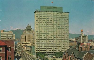 | Keywords: outdoor building architecture city "Vancouver, B. C., Canada - Burrard Street, B.C. Electric Building in foreground." Color photograph and published by The Coast Publishing Co., Vancouver, Canada.  Vancouver, BC looking north from the south wing of St. Paul's Hospital on Burrard Street with the new BC Electric Building as central subject, c.1957. "Vancouver, B. C., Canada - Burrard Street, B.C. Electric Building in foreground." Color photograph and published by The Coast Publishing Co., Vancouver, Canada.  Vancouver, BC looking north from the south wing of St. Paul's Hospital on Burrard Street with the new BC Electric Building as central subject, c.1957. |