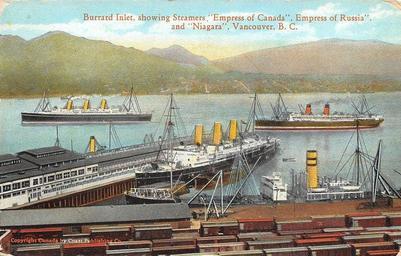 Keywords: outdoor "Burrard Inlet, showing Steamers "Empress of Canada", Empress of Russia", and "Niagara", Vancouver, B. C. Copyright Canada by Coast Publishing Co." Post Card. 102788. Published by The Coast Publishing Co., Vancouver, B. C. Made in U.S.A. View looking north towards Burrard Inlet and the North Shore and North Vancouver over the Canadian Pacific Waterfront Railway yard and docks (Pier 'D') in Vancouver, BC. "Burrard Inlet, showing Steamers "Empress of Canada", Empress of Russia", and "Niagara", Vancouver, B. C. Copyright Canada by Coast Publishing Co." Post Card. 102788. Published by The Coast Publishing Co., Vancouver, B. C. Made in U.S.A. View looking north towards Burrard Inlet and the North Shore and North Vancouver over the Canadian Pacific Waterfront Railway yard and docks (Pier 'D') in Vancouver, BC. |