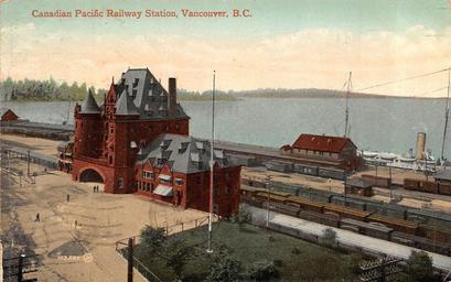 Keywords: outdoor "Canadian Pacific Railway Station, Vancouver, B.C." Post Card. The Valentine & Sons' Publishing Co., Ltd. Montreal and Toronto. Printed in Great Britain. The second CPR Station (1899-1914), foot of Granville Street, Vancouver, BC. Located at the northern foot of Granville Street, the first little wooden station and platform, built just in time for the arrival of the first train in May 1887, was demolished in 1898 to make way for this much grander structure. Built in 1899 in the CPR's famous "railroad baronial chateau" style, with two bulging turrets and a grand arch connecting Granville Street with the platform and trains. It was demolished after the completion of the third CPR station (1914), one block to the east (at 601 W. Cordova St.). It has been suggested that due to poor-quality bricks used in its construction the building had to be torn down. "Canadian Pacific Railway Station, Vancouver, B.C." Post Card. The Valentine & Sons' Publishing Co., Ltd. Montreal and Toronto. Printed in Great Britain. The second CPR Station (1899-1914), foot of Granville Street, Vancouver, BC. Located at the northern foot of Granville Street, the first little wooden station and platform, built just in time for the arrival of the first train in May 1887, was demolished in 1898 to make way for this much grander structure. Built in 1899 in the CPR's famous "railroad baronial chateau" style, with two bulging turrets and a grand arch connecting Granville Street with the platform and trains. It was demolished after the completion of the third CPR station (1914), one block to the east (at 601 W. Cordova St.). It has been suggested that due to poor-quality bricks used in its construction the building had to be torn down. |