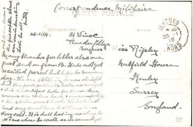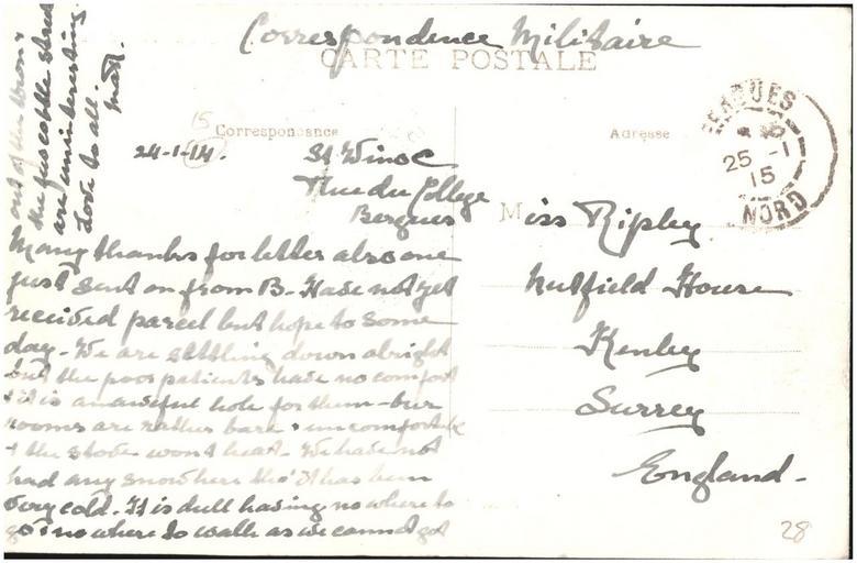 Keywords: postcard bergues nurse ripley public domain publicdomain ww1 nurse ripley nurseripley document writing text sketch drawing monochrome Sent by a nurse, Margaret Ripley, to her sister back in England. As far as I can tell (corrections and additions welcome) this reads: "St Winoc Rue de College Bergues Many thanks for letter olso one just sent on from B[ordeaux]. Have not yet received parcel but hope to some day. We are settling down alright but the poor patients have no comfort and it is an awful hole for them - our rooms are rather dark & uncomfotable & the stove won't heat. We have not had any snow here 'tho it has been very cold. It is dull having no where to go and no where to walk as we cannot get out of the town& the few cobble streets are uninteresting. Love to all. Mar" * I originally thought this read St Winse, but am pretty certain it is St Winoc - see www.stwinoc.fr/ Clearly she is not to impressed by Bergues, though it looks like quite a nice place today! For more details of the story behind this album see www.flickr.com/photos/whatsthatpicture/sets/7215762769463... Sent by a nurse, Margaret Ripley, to her sister back in England. As far as I can tell (corrections and additions welcome) this reads: "St Winoc Rue de College Bergues Many thanks for letter olso one just sent on from B[ordeaux]. Have not yet received parcel but hope to some day. We are settling down alright but the poor patients have no comfort and it is an awful hole for them - our rooms are rather dark & uncomfotable & the stove won't heat. We have not had any snow here 'tho it has been very cold. It is dull having no where to go and no where to walk as we cannot get out of the town& the few cobble streets are uninteresting. Love to all. Mar" * I originally thought this read St Winse, but am pretty certain it is St Winoc - see www.stwinoc.fr/ Clearly she is not to impressed by Bergues, though it looks like quite a nice place today! For more details of the story behind this album see www.flickr.com/photos/whatsthatpicture/sets/7215762769463... |