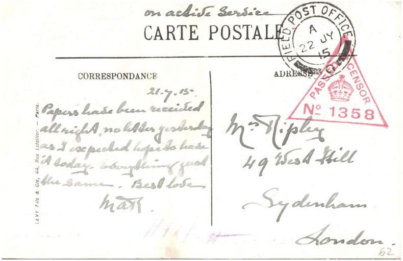 Keywords: france war world war 1 worldwar1 ww1 postcard ripley public domain publicdomain nurse ripley nurseripley text writing drawing sketch Sent by a nurse, Margaret Ripley, to her mother back in England. Interesting that this card is the first for over a month. Did she not send any, or are they simply missing from this album? Given teh brevity and tone of the message I highly doubt this was the first time she had written for a long while. As far as I can tell (corrections and additions welcome) this reads: "21.7.15 Papers have been received all right. No letter yesterday as I expected hope to have it today. Everything just the same. Best love Mar" For more details of the story behind this album see www.flickr.com/photos/whatsthatpicture/sets/7215762769463... Sent by a nurse, Margaret Ripley, to her mother back in England. Interesting that this card is the first for over a month. Did she not send any, or are they simply missing from this album? Given teh brevity and tone of the message I highly doubt this was the first time she had written for a long while. As far as I can tell (corrections and additions welcome) this reads: "21.7.15 Papers have been received all right. No letter yesterday as I expected hope to have it today. Everything just the same. Best love Mar" For more details of the story behind this album see www.flickr.com/photos/whatsthatpicture/sets/7215762769463... |