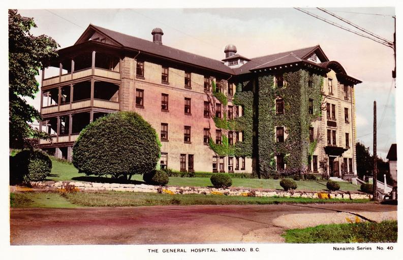 | Keywords: building architecture outdoor "The General Hospital, Nanaimo, B. C. Nanaimo Series No. 40" Post Card. This is a Real Photograph. Hand Coloured. Copyright, J. Fred Spalding. Published by The Camera Products Co., 1731, Dunbar Street, Vancouver, B.C. Made in England.  Nanaimo Hospital, Miss F. H. Archer, Superintendent, W. McGirr, Secretary. Phone 5. [1940] 375 Kennedy Street (W corner at Franklyn Street), Nanaimo, BC on Vancouver Island.  Built 1925; extant. Now Chartwell Malaspina Gardens Care Residence, 388 Machleary Street. "The General Hospital, Nanaimo, B. C. Nanaimo Series No. 40" Post Card. This is a Real Photograph. Hand Coloured. Copyright, J. Fred Spalding. Published by The Camera Products Co., 1731, Dunbar Street, Vancouver, B.C. Made in England.  Nanaimo Hospital, Miss F. H. Archer, Superintendent, W. McGirr, Secretary. Phone 5. [1940] 375 Kennedy Street (W corner at Franklyn Street), Nanaimo, BC on Vancouver Island.  Built 1925; extant. Now Chartwell Malaspina Gardens Care Residence, 388 Machleary Street. |
